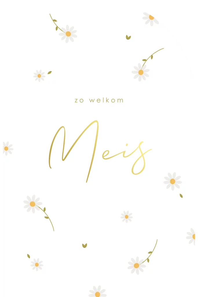 Een lente thema geboortekaartje in een arch vorm. Dit originele maar lieve geboortekaartje heeft een rustig ontwerp met witte achtergrond en verschillende kleine madeliefjes. De naam wordt gedrukt in goudfolie. Pas het ontwerp gemakkelijk zelf aan in onze online editor.
