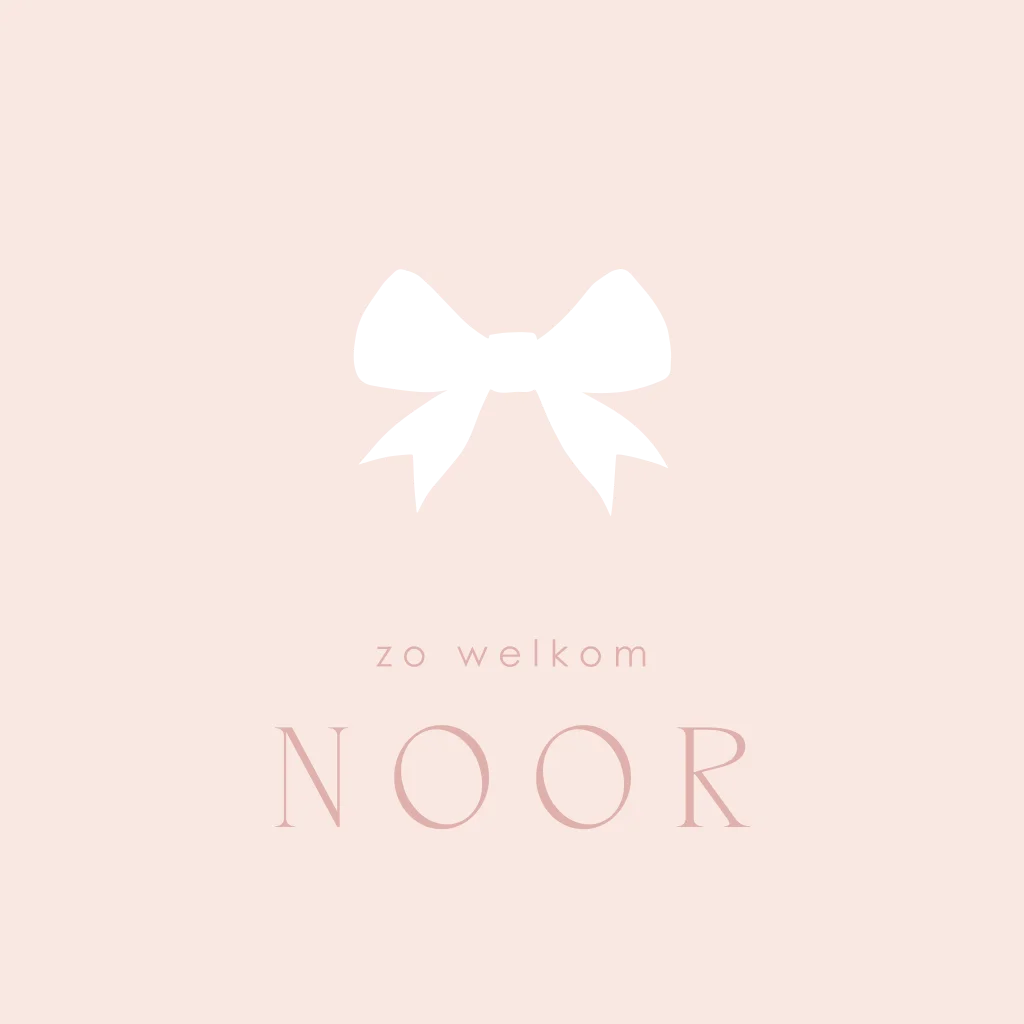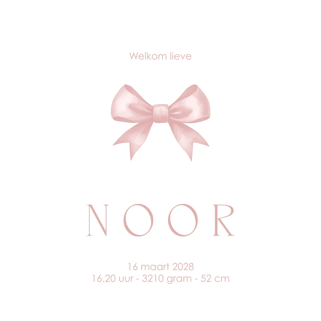Een lief en romantisch geboortekaartje voor jouw meisje. Het kaartje heeft een roze achtergrond. Je ziet een doorkijkje naar een schattige illustratie van een strikje. Pas het ontwerp naar wens aan in onze online editor.
