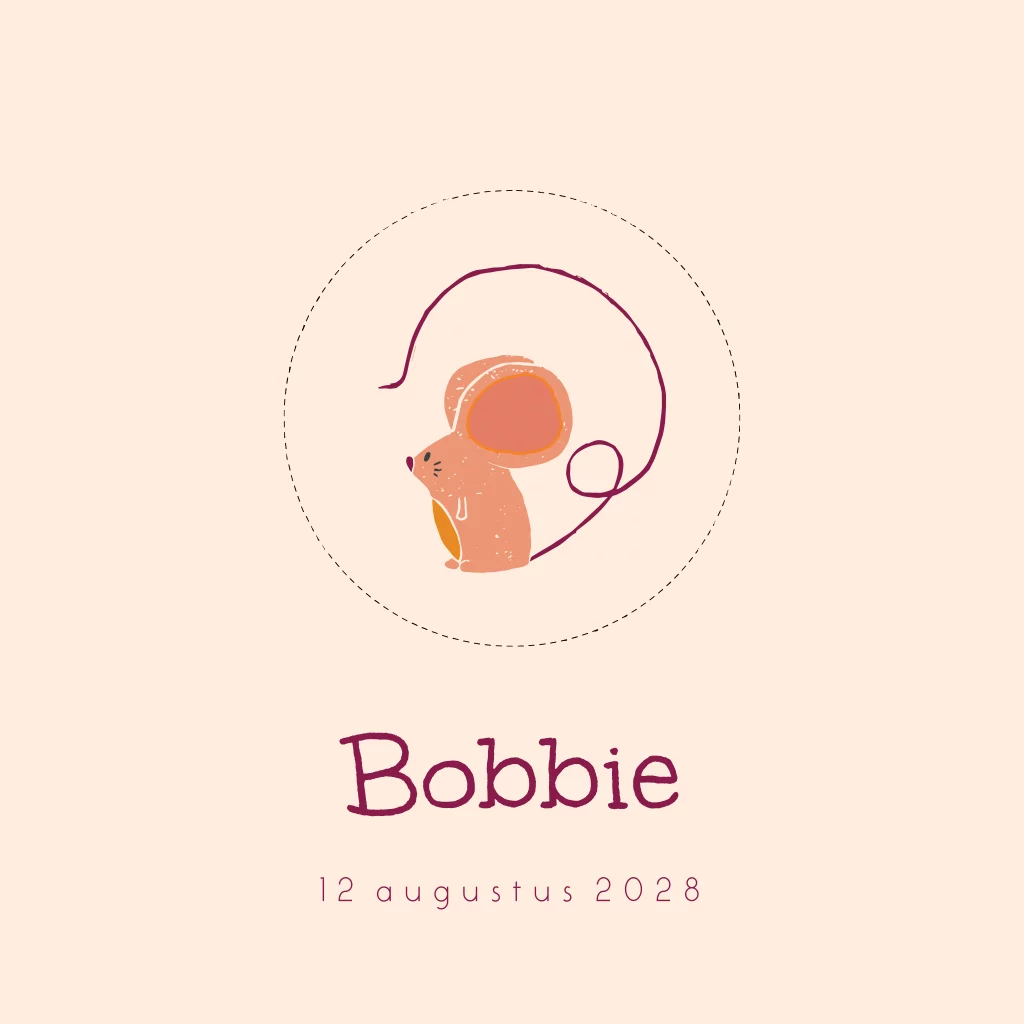 Wat een vrolijk geboortekaartje voor jouw kindje! Het kaartje heeft een oranje streepjes achtergrond. Daarnaast zie je een doorkijkje naar een muisje. Pas het ontwerp naar wens zelf aan.