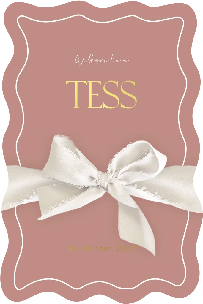 Een stijlvol geboortekaartje met golvende rand en tekst in goudfolie voor een luxe finish. Het kaartje heeft een oudroze achtergrond. Het kaartje kan je verrijken met zijden lint. Pas het ontwerp naar wens aan in onze online editor.