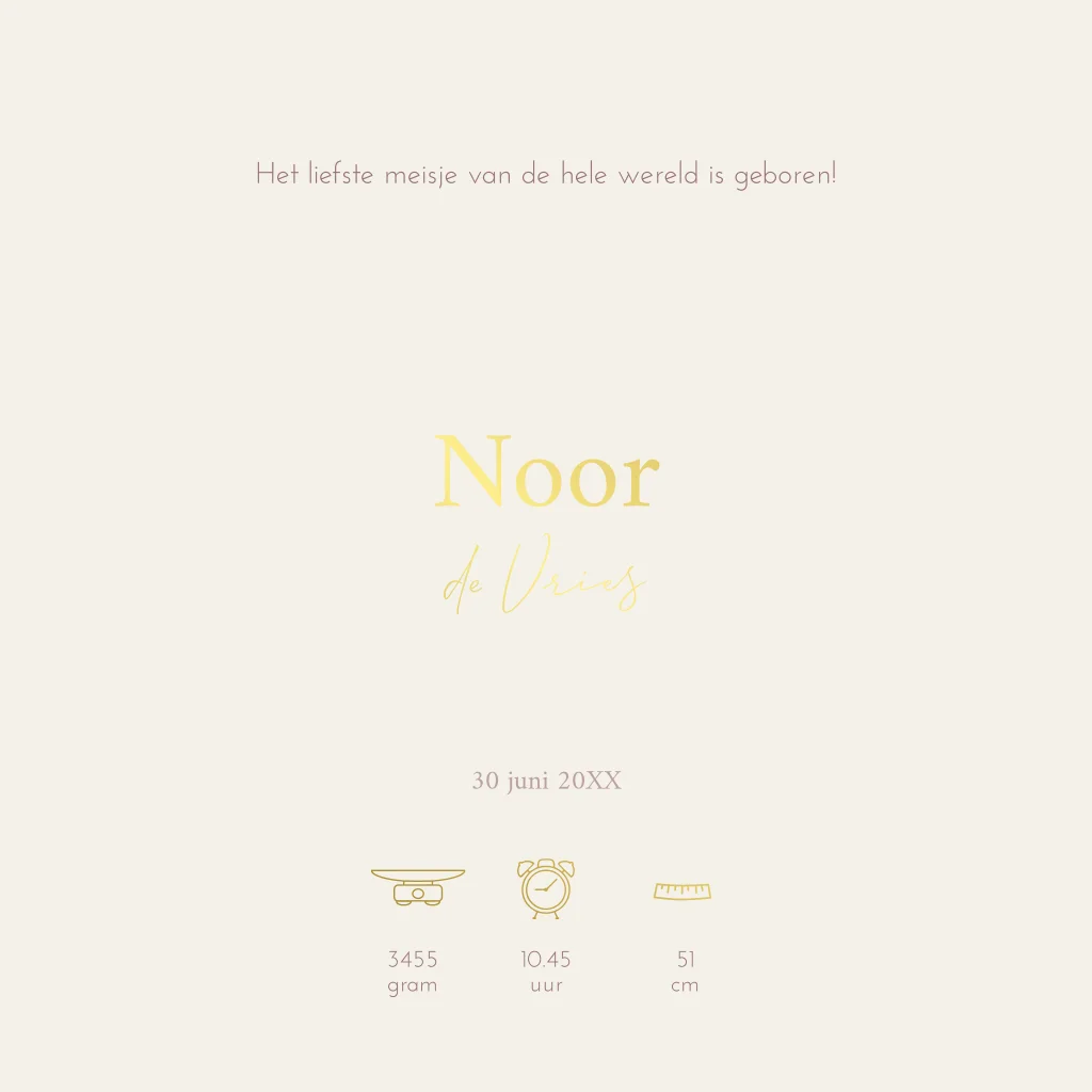 Een lief geboortekaartje met een watercolour design van kleine bloemetjes in zachte tinten. Door de opening, een doorkijkje, aan de voorkant van deze kaart zie je de naam van jullie kindje gedrukt met goudfolie. Pas dit kaartje naar wens aan in onze online editor.