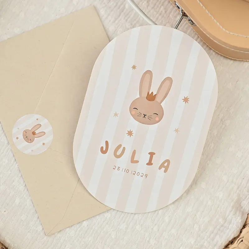 Wat een schattig geboortekaartje voor jouw kindje. Het kaartje heeft een streepjespatroon met leuke illustraties van een konijn en sterretjes. Pas het ontwerp naar wens aan in onze online editor. #jolien