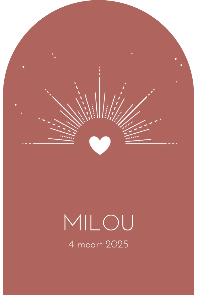 Een lief origineel geboortekaartje voor jouw toekomstige dochter. Dit kaartje heeft de bijzondere vorm van een arch. Op het kaartje zie je een halve zon en een hartje. Het kaartje heeft een stijlvol ontwerp en is echt origineel in zijn vorm.