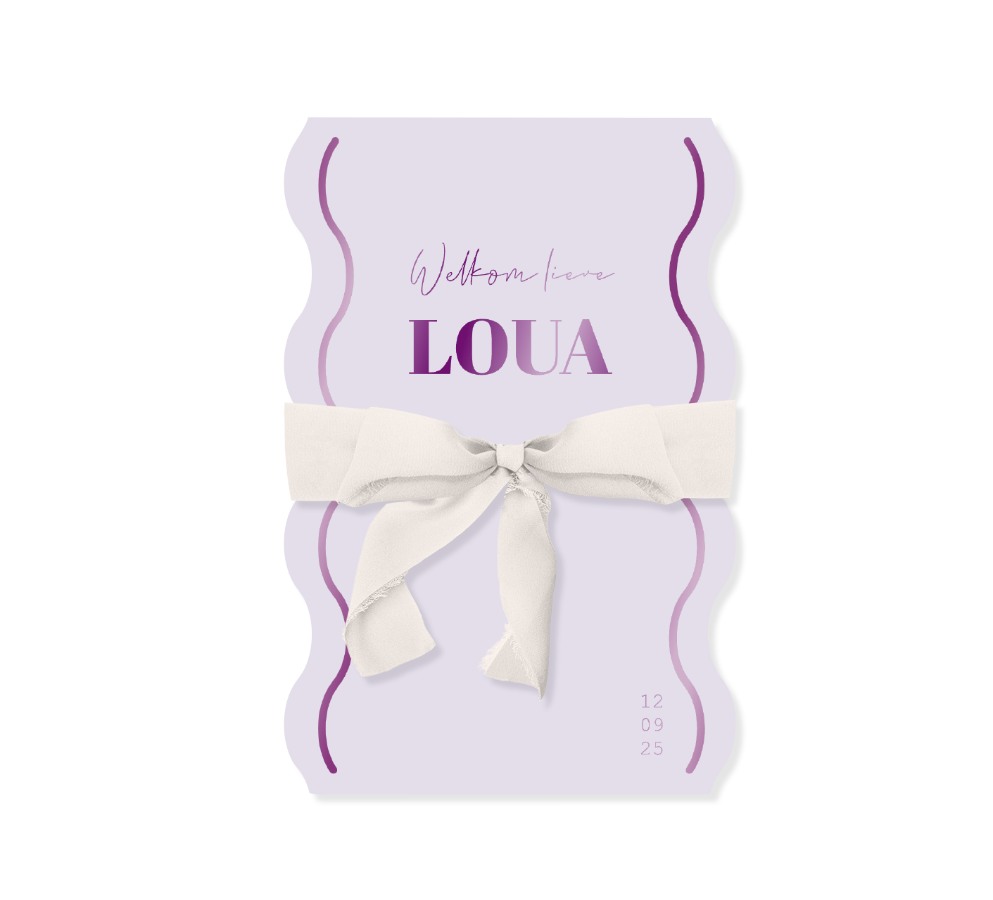 Hip en lief geboortekaartje voor jouw kindje. Het kaartje heeft een golvende rand met hoogglans details. Het kaartje kan je verrijken met zijden lint.