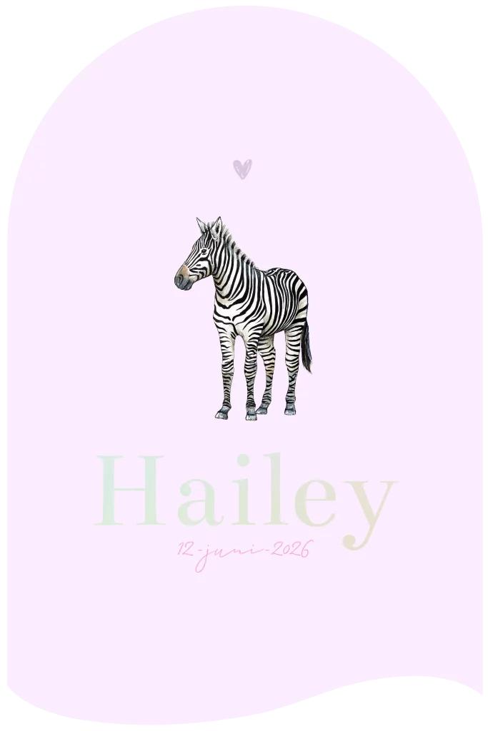 Bijzondere vorm geboortekaartje met een illustratie van de zebra, getekend door BINTJE. Het kaartje heeft een lila achtergrond. De onderkant van het kaartje heeft een golfvorm. Dit kaartje is helemaal zelf aanpassen in de editor. Maak met andere kleuren, lettertypes of een ander diertje er je eigen geboortekaartje van.