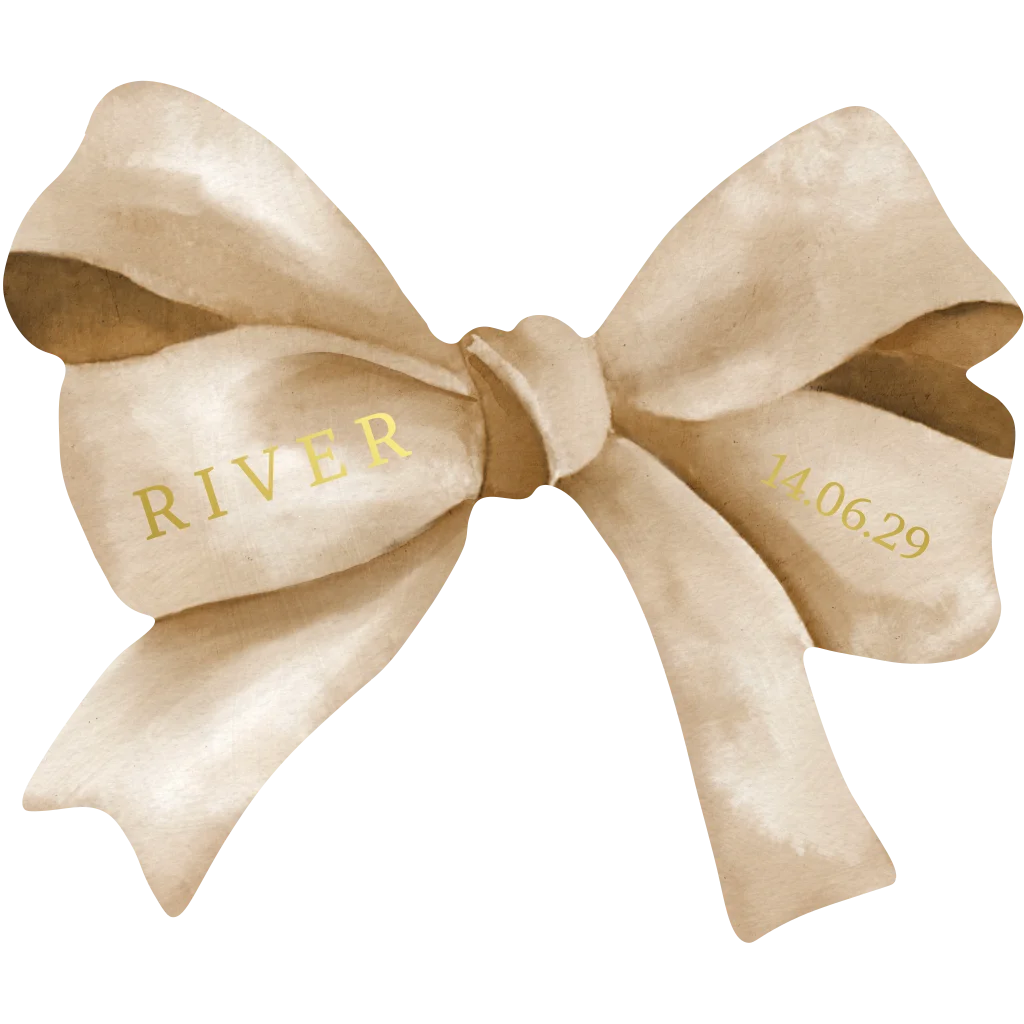 Een origineel geboortekaartje voor jouw kindje. Deze kaart heeft de vorm van een strik. De strik is beige. Pas het ontwerp naar wens aan in onze online editor.