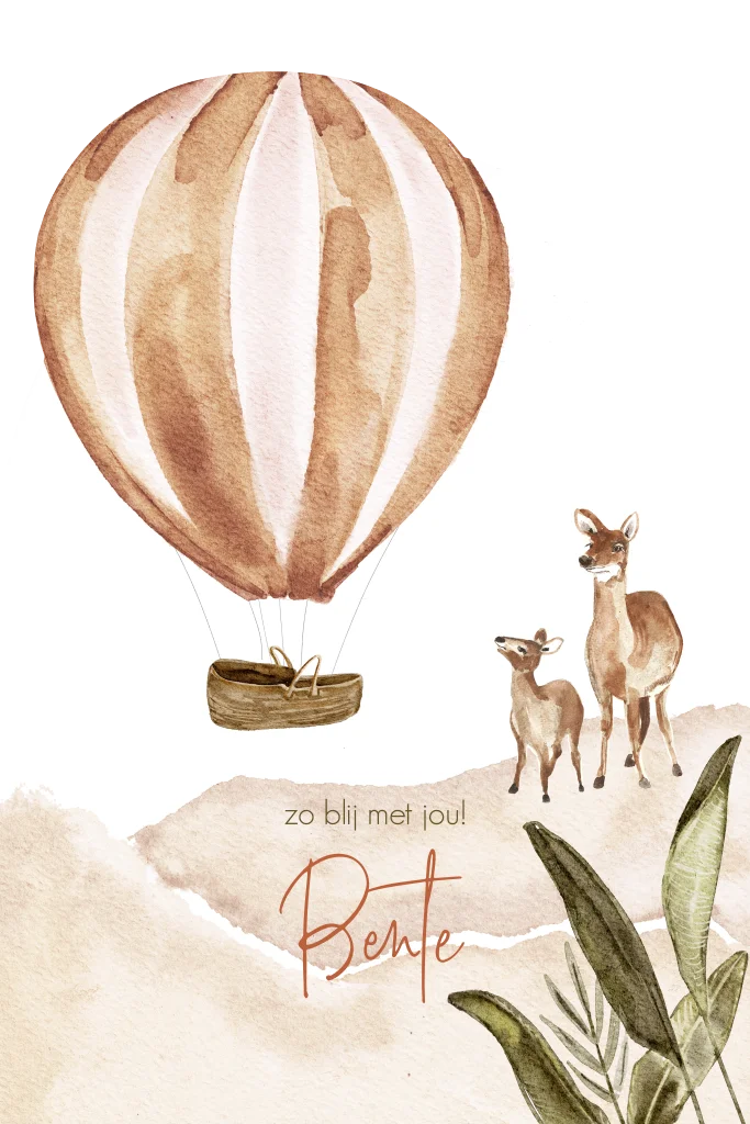 Een origineel geboortekaartje met watercolour ontwerp. Het ontwerp bestaat uit een luchtballon met een mandje en twee hertjes. In onze online editor kan je gemakkelijk de naam aanpassen en kiezen uit verschillende lettertypes. Bestel en proefdruk en bekijk het resultaat in het echt!