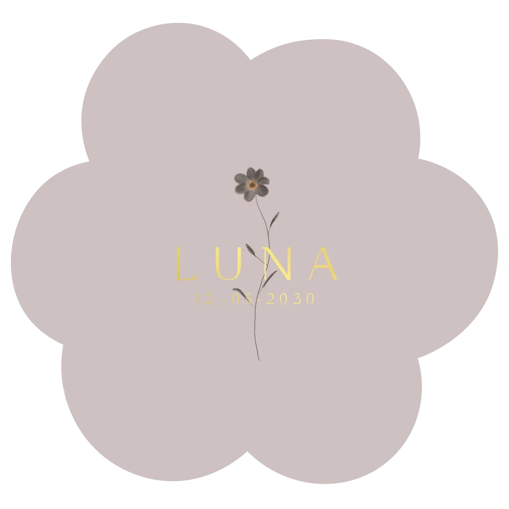 Een lief geboortekaartje voor een meisje in een originele vorm van een bloem. De naam van jullie dochtertje is in goudfolie gedrukt op een pastel paarse achtergrond. Om het kaartje compleet te maken is er een minimalistische watercolour bloem toegevoegd aan het ontwerp.