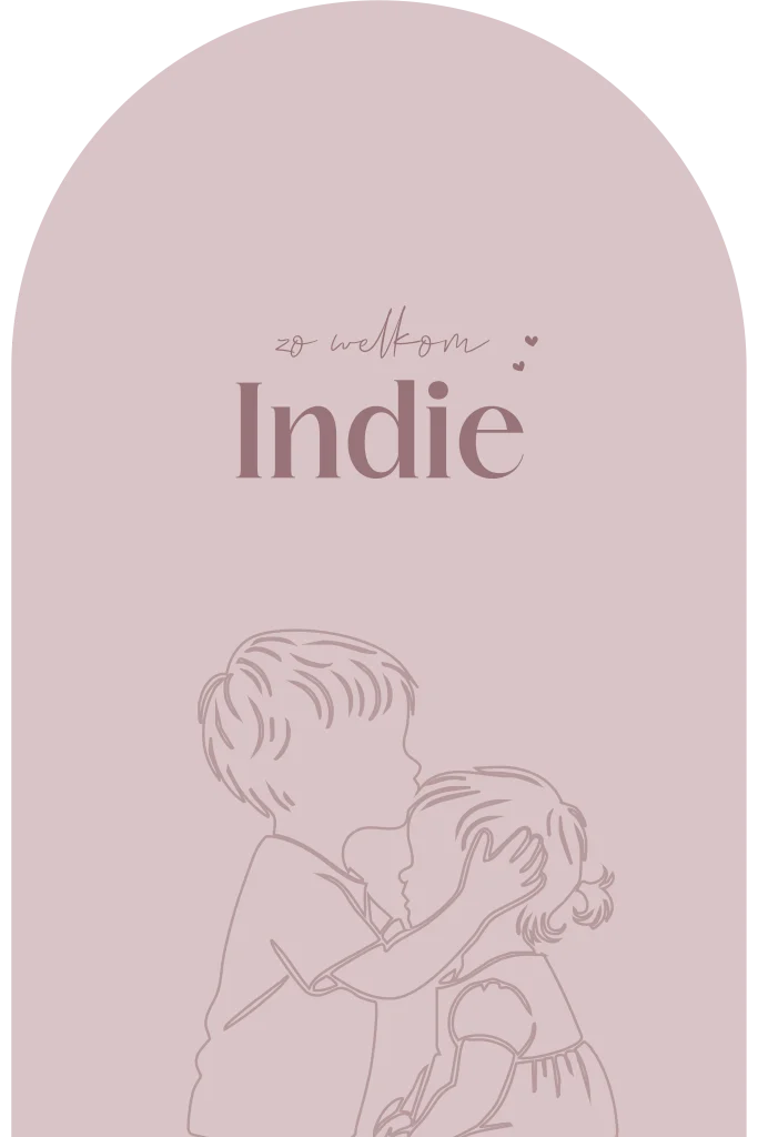Lief geboortekaartje voor een tweede kindje. Het kaartje heeft een boog vorm met paarse achtergrond. Op het kaartje zie je een mooie lijntekening van een grote broer met zijn kleine zusje. Pas het ontwerp naar wens aan in onze online editor.