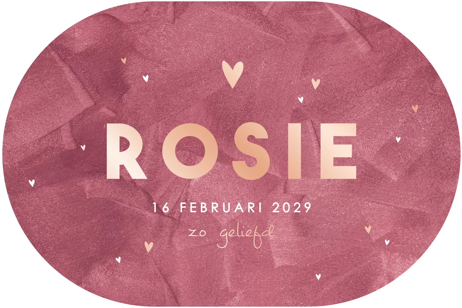 Een lief en origineel geboortekaartje voor jouw dochter. Het kaartje heeft een liggende ovale vorm met roze velvet-look achtergrond. De naam wordt gedrukt met roségoudfolie.