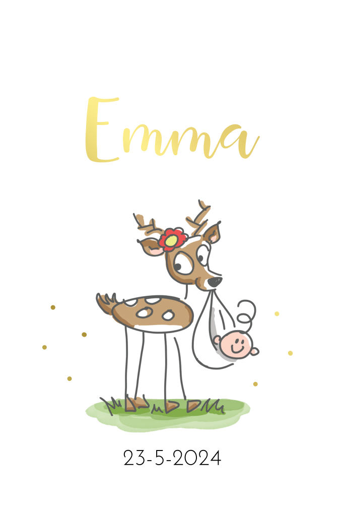 Kondig de geboorte van jullie dochtertje aan met dit originele kaartje. Het kaartje heeft de vorm van een arch. Op dit kaartje staat de illustratie van een hert met baby. De goudfolie details maken dit kaartje helemaal compleet.