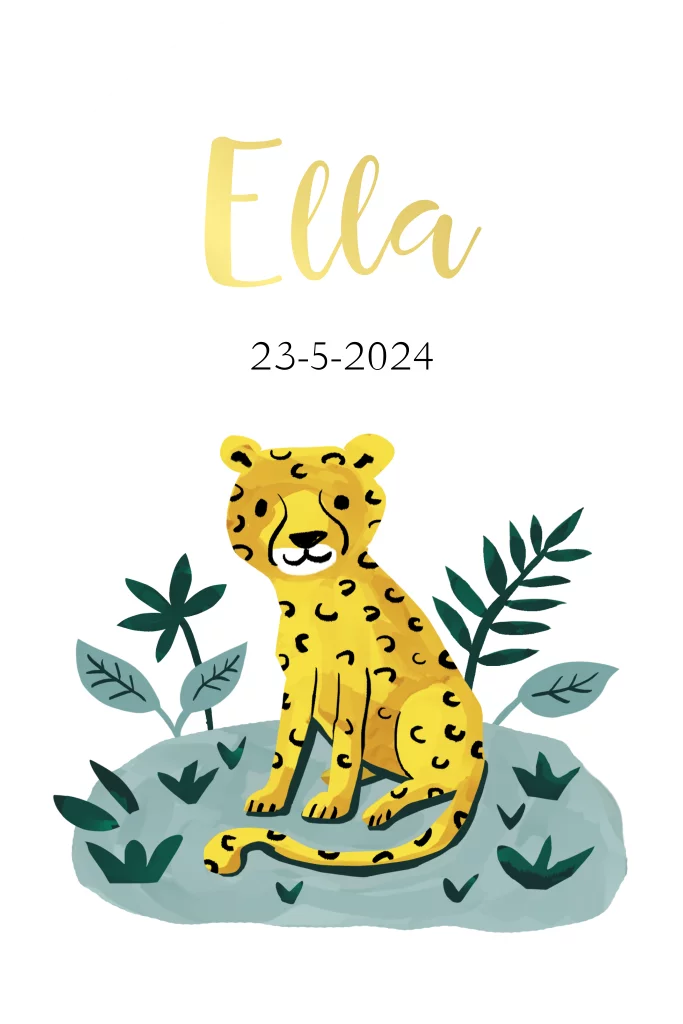Dit is een avontuurlijk geboortekaartje voor jullie dochter. Het kaartje heeft de vorm van een arch. De illustratie van de panter geeft dit kaartje een stoere uitstraling. De naam in goudfolie maakt dit kaartje helemaal af.