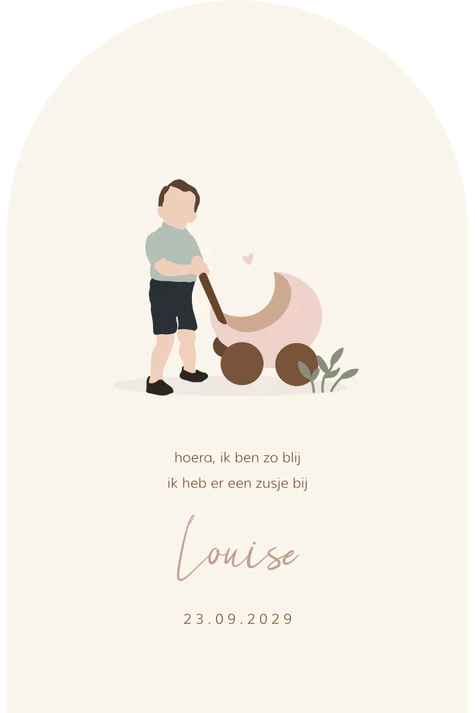 Dit is een lief kaartje voor jullie pasgeboren dochter en zusje. Het kaartje heeft de vorm van een arch. Op het kaartje staat de tekening van een grote broer met een kinderwagen. Pas het kaartje naar wens aan in onze online editor en bestel snel een proefdruk om dit kaartje in het echt te zien!