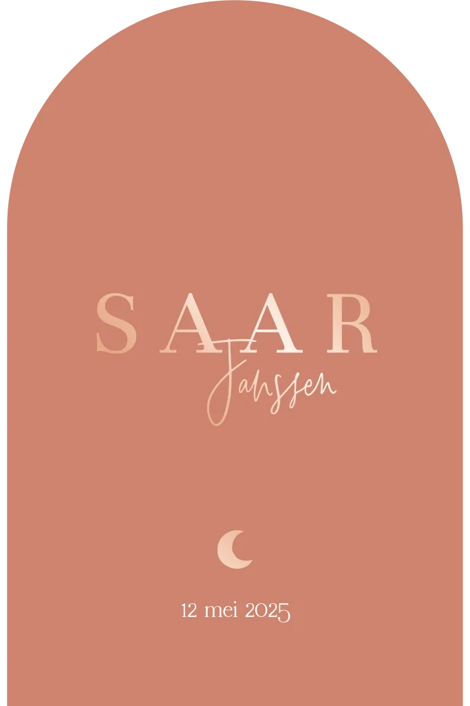 Dit geboortekaartje voor jullie dochter is helemaal hip. De roségoudfolie typografie en details komen prachtig naar voren tegen de terra kleurige achtergrond. Het maantje maakt dit kaartje extra lief. Het kaartje heeft de vorm van een arch. Pas het kaartje naar wens aan in de online editor!