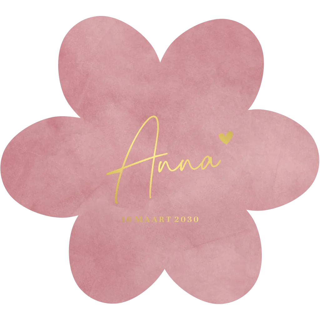 Dit is een lief kaartje voor jullie pasgeboren dochter. Het kaartje heeft de vorm van een bloem met roze velvet-look achtergrond. De naam, geboortedatum en het kleine hartje worden gedrukt in goudfolie. Het kaartje is naar wens aan te passen in onze online editor.