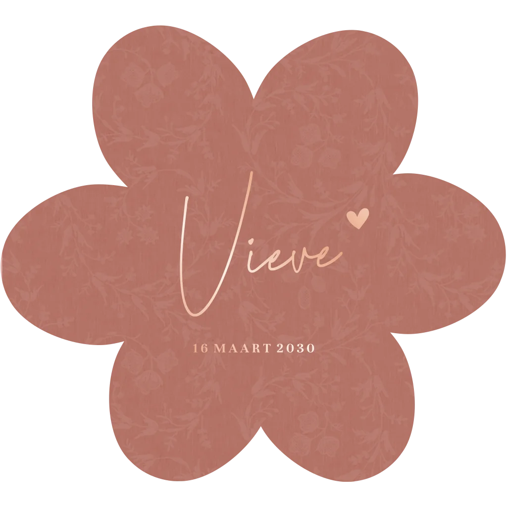 Uniek geboortekaartje met roségoudfolie in de vorm van een bloem