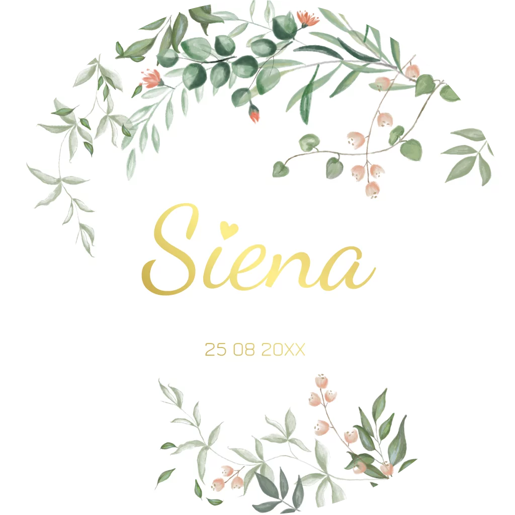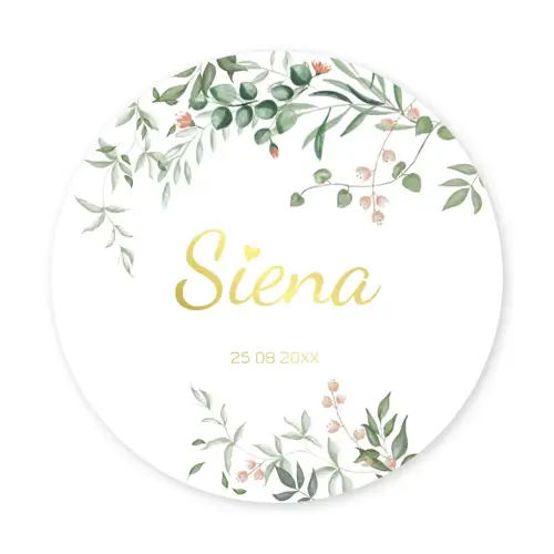 Dit is een lief geboortekaartje voor jullie dochter. Het kaartje heeft de vorm van een cirkel. De naam en geboortedatum staan centraal op het kaartje en worden gedrukt in goudfolie. De takjes en kleine bloemetjes geven dit kaartje een schattige uitstraling. Pas het kaartje naar wens aan in onze online editor en bestel snel een proefdruk om dit kaartje in het echt te zien!
