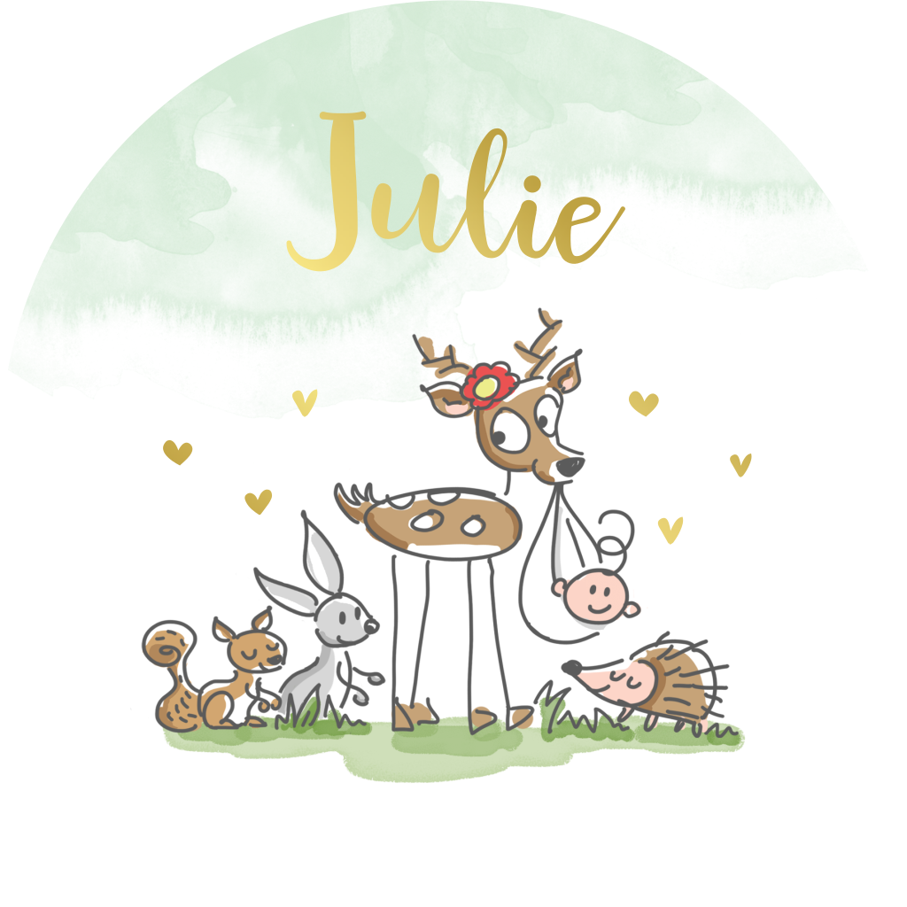 Een schattig geboortekaartje voor jullie dochter of zoon. Op het kaartje staan illustraties van verschillende bosdieren, zoals een hert, eekhoorn, konijn en egel. De goudfolie typografie en details maken dit kaartje helemaal compleet! De kaart heeft de vorm van een cirkel.