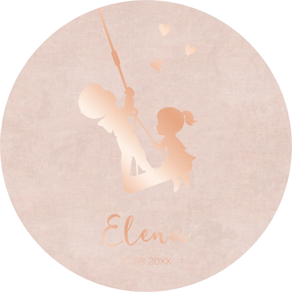 Dit is een luxe geboortekaartje voor jullie dochter. Het kaartje heeft de vorm van een cirkel. Op het kaartje staan twee silhouetjes op een schommel in roségoudfolie. Pas het kaartje naar wens aan in onze online editor en bestel snel een proefdruk om dit kaartje in het echt te zien!