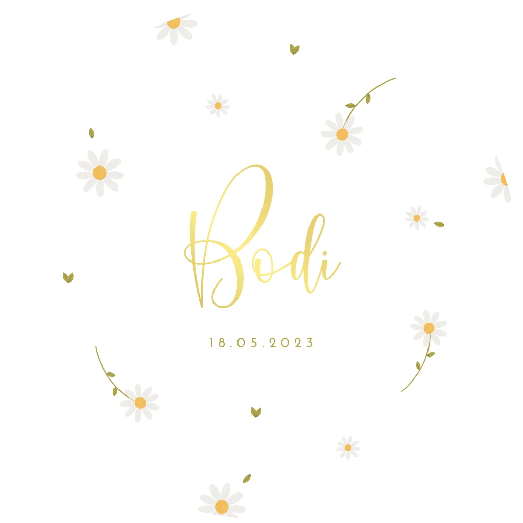 Kondig de geboorte van jullie zoon of dochter aan met dit lieve kaartje! Het kaartje is rond en daardoor extra uniek. De naam en geboortedatum worden gedrukt in goudfolie. Op de achtergrond zijn madeliefjes te zien. Het kaartje is volledig naar wens aan te passen in onze online editor.