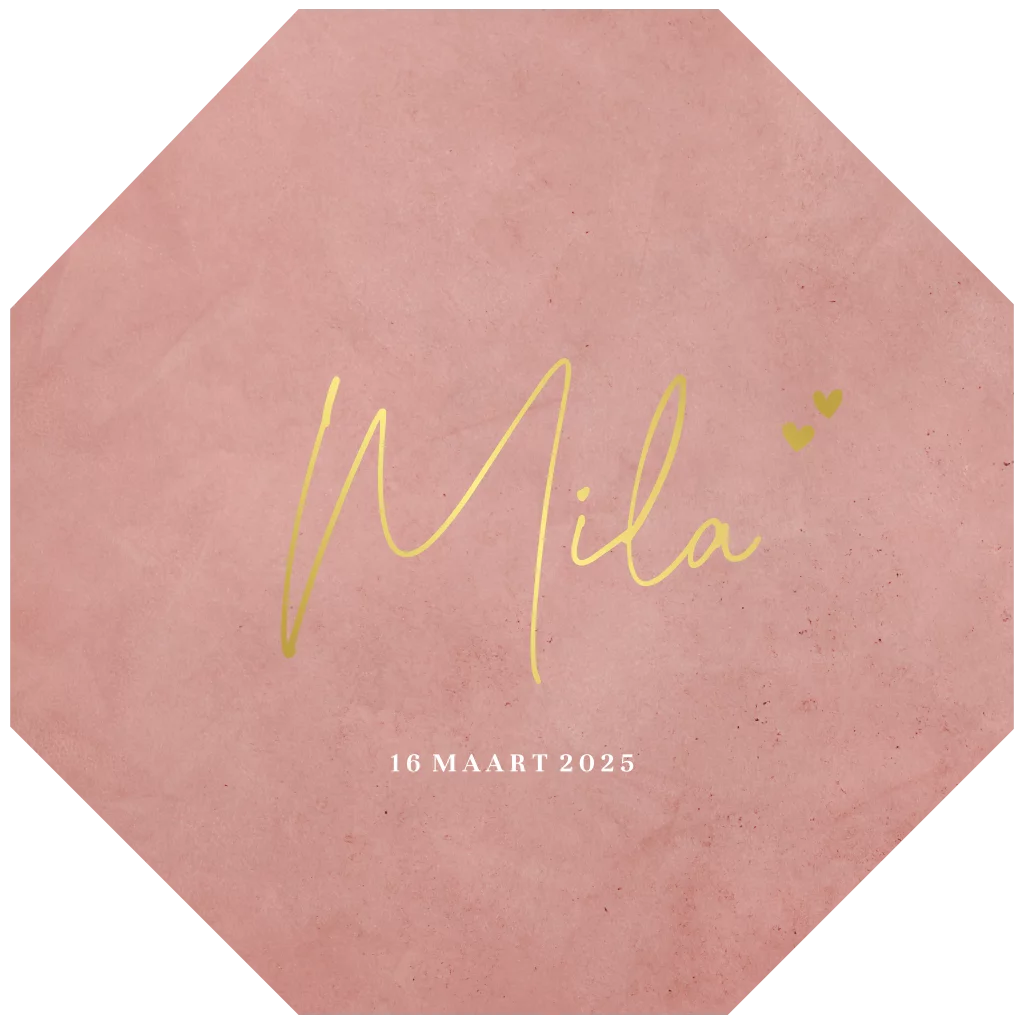 Dit is een stoer kaartje voor jullie pasgeboren dochter. Het kaartje heeft de vorm van een hexagon met een roze velvet-look achtergrond. De goudfolie naam geeft dit kaartje een luxe uitstraling. Pas het kaartje naar wens aan in onze online editor en bestel snel een proefdruk om dit kaartje in het echt te zien!