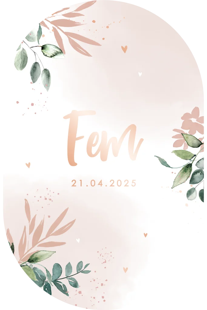 Uniek geboortekaartje met roségoudfolie en bloemen in ovaal vorm