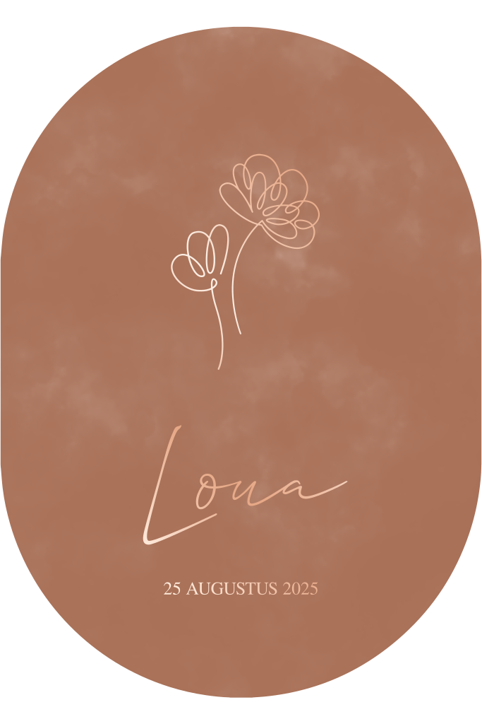 Kondig de geboorte van jullie dochtertje aan met dit originele kaartje! Het kaartje heeft de vorm van een ovaal met bruine achtergrond. De roségoudfolie opdruk geeft dit kaartje een luxe uitstraling. Pas het kaartje naar wens aan in onze online editor en bestel snel een proefdruk om dit kaartje in het echt te zien!