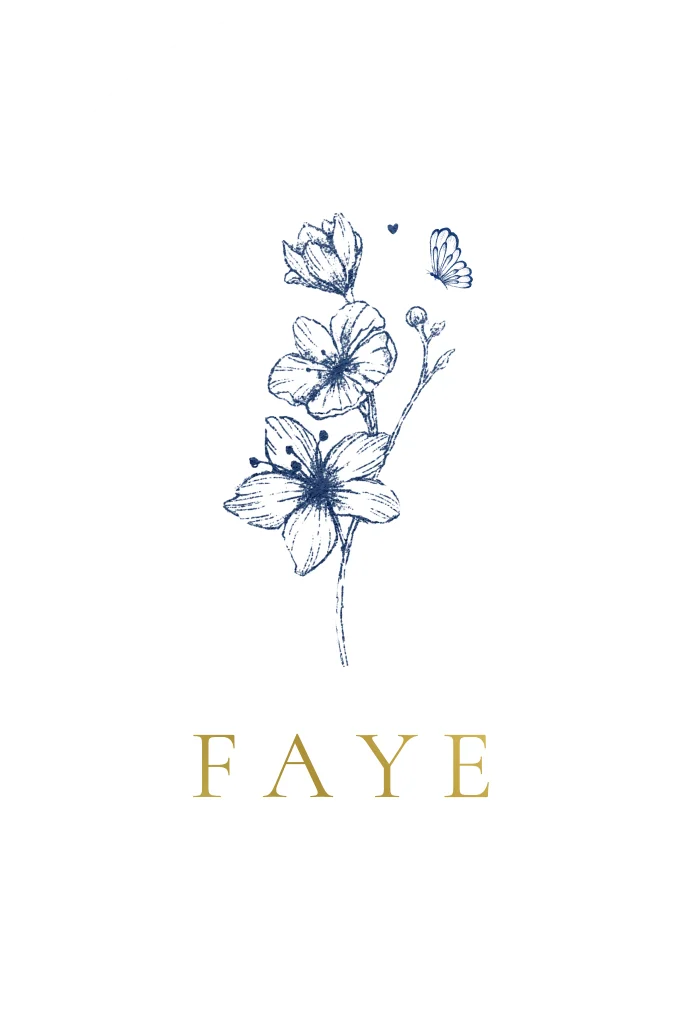 Dit is een uniek kaartje voor de geboorte van je dochter. Het kaartje heeft de vorm van een ovaal met de illustraties van bloemen. De naam wordt gedrukt in goudfolie, waardoor dit kaartje een luxe uitstraling krijgt. Het kaartje is naar wens aan te passen in onze online editor.