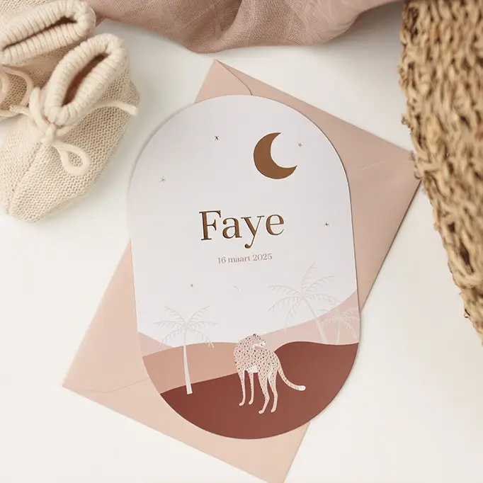 Kondig de geboorte van jullie dochtertje aan met deze unieke stanskaart! Een panter staat geïllustreerd in een abstract landschap. De naam van jullie kleintje en de maan worden gedrukt in roségoudfolie. Het kaartje heeft de vorm van een ovaal. Bestel snel een proefdruk om deze kaart in het echt te bewonderen!