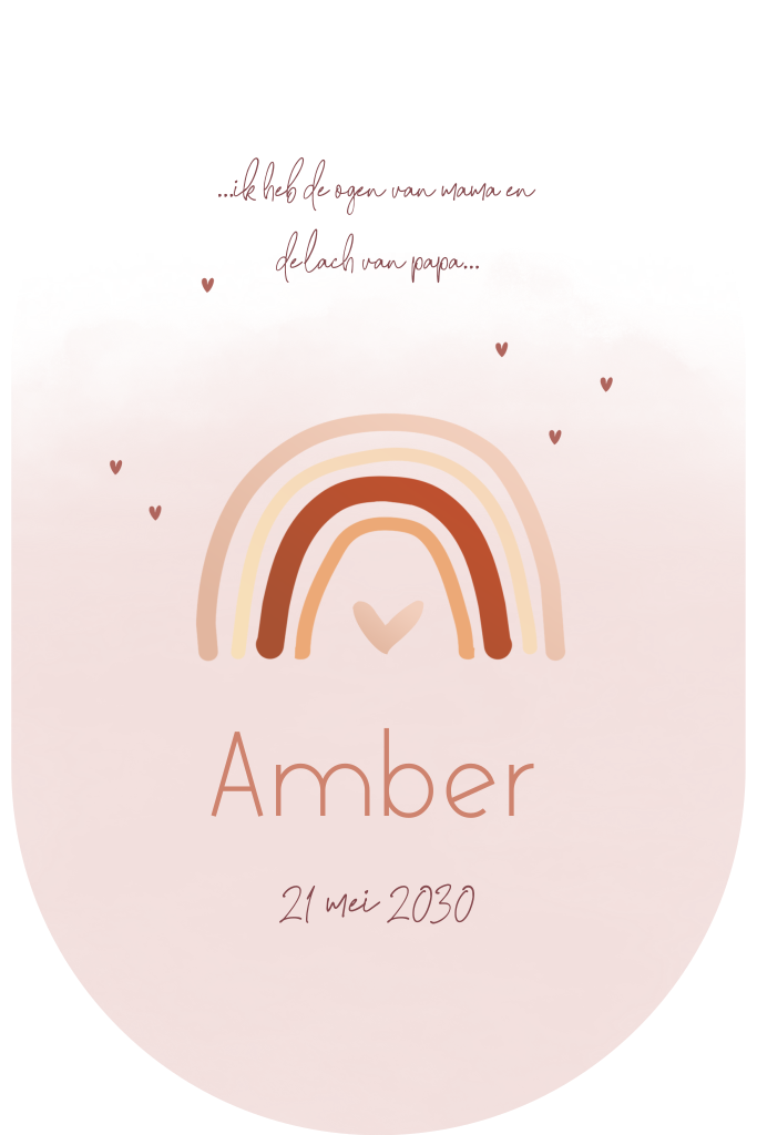Dit is een uniek kaartje voor de geboorte van jullie dochter. Het kaartje heeft de vorm van een ovaal. De lichtroze achtergrond staat mooi in combinatie met de regenboog in roze- en roodtinten. De hartjes maken dit kaartje helemaal compleet. Pas het kaartje naar wens aan in onze online editor en bestel een proefdruk om dit kaartje in het echt te zien!