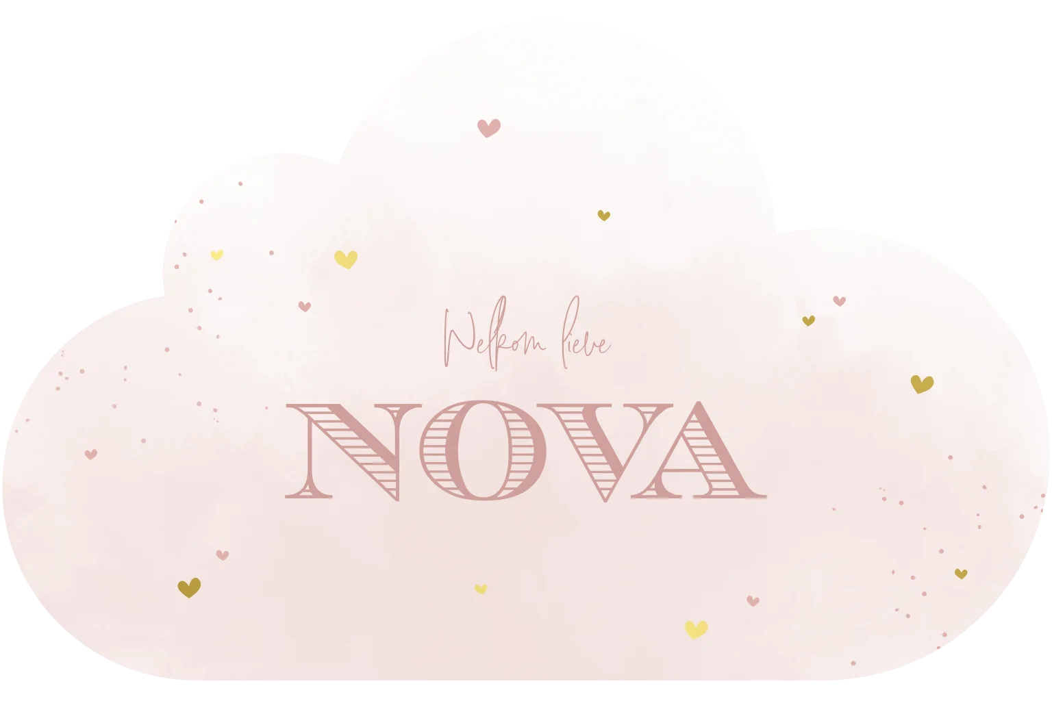 Uniek geboortekaartje in de vorm van een wolk met goudfolie en hartjes