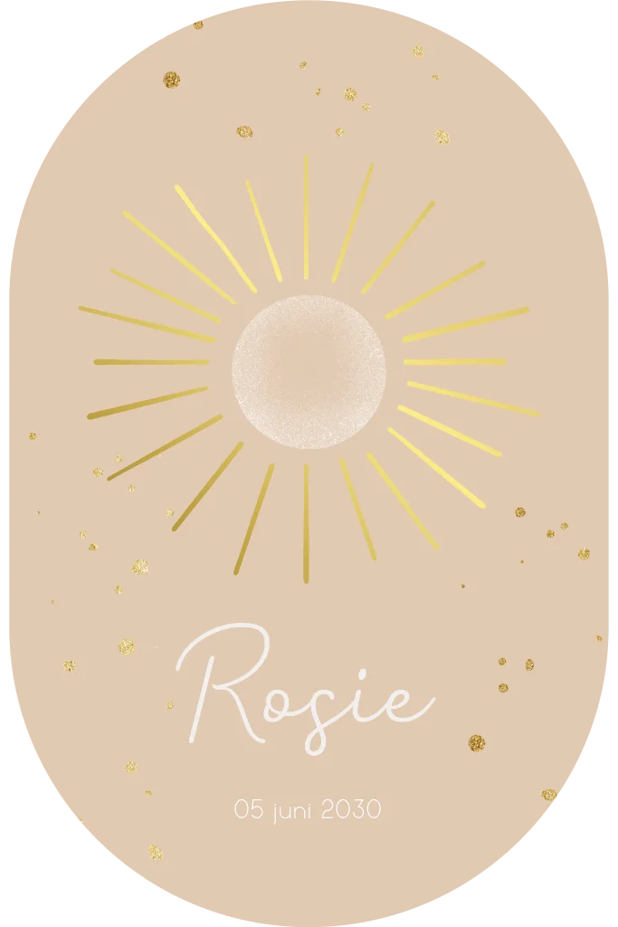 Een stijlvol geboortekaartje voor jullie dochter. Op dit originele geboortekaarje in een ovaal vorm zie je een goudfolie zon en verschillende spetters. Dit kaartje is ontworpen door influencer Annemiek van Babybirdstore