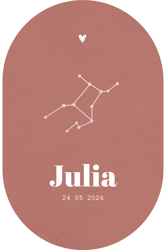 Een origineel geboortekaartje in ovale vorm. Het kaartje heeft een rood/roze structuur achtergrond met op de voorgrond het sterrenbeeld van jouw meisje. Onder het sterrenbeeld is er ruimte voor de naam en geboortedatum.