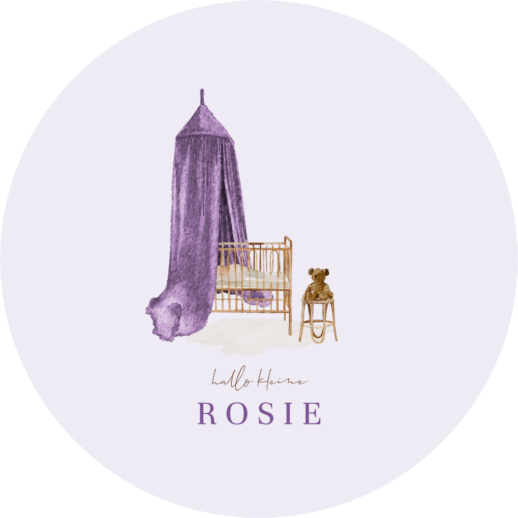 Kondig de geboorte van jullie dochter aan met dit lieve kaartje! Het kaartje is rond met een lila achtergrond. Centraal op het kaartje is een wiegje met klamboe getekend met daarnaast een beertje op een kruk. Helemaal fan van dit kaartje? Bewerk het kaartje in onze online editor en bestel een proefdruk om dit kaartje in het echt te zien!
