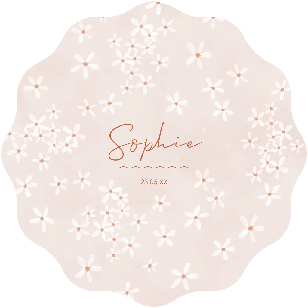 Een origineel geboortekaartje voor een meisje in de vorm van een bloem. Het kaartje heeft een golvende rand en een patroon van getekende bloemetjes