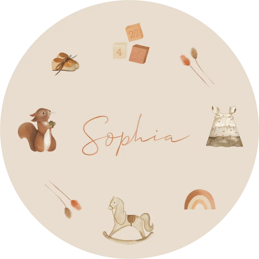 Een origineel rond geboortekaartje voor een meisje. De naam is sierlijk geschreven en in glanzend hoogglans gedrukt.