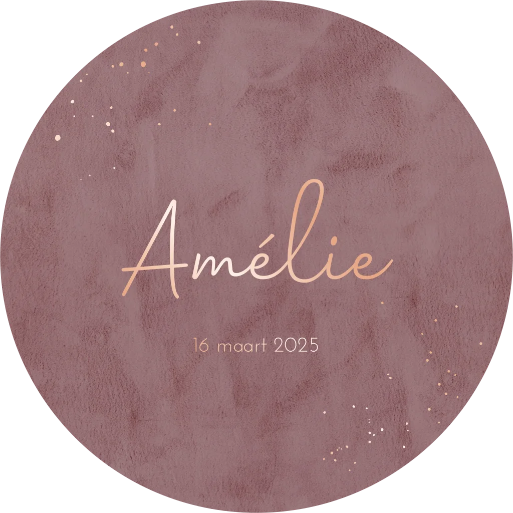 Origineel rond geboortekaartje met roségoudfolie en paarse velvet-look