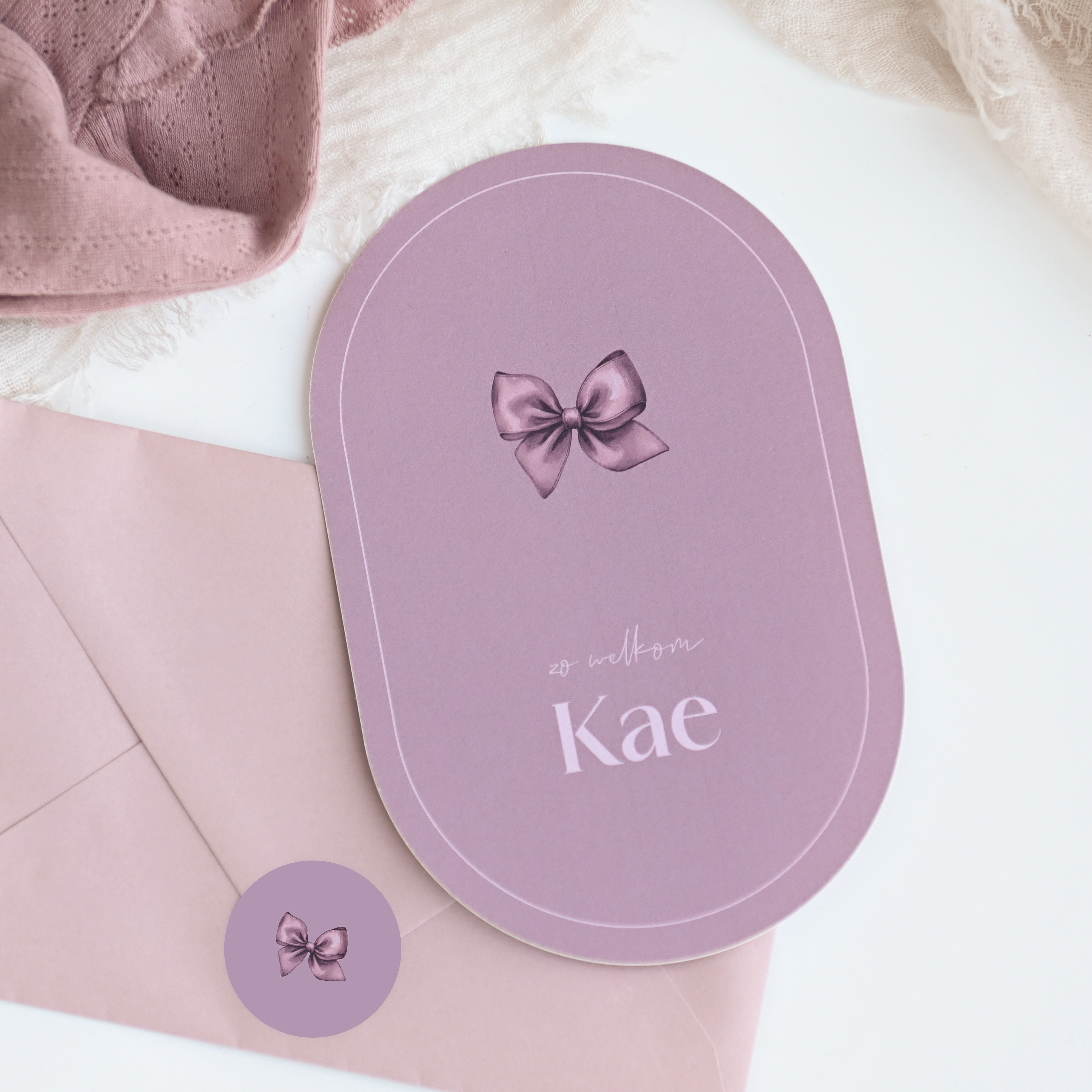 Kondig de geboorte van jullie kleine meisje aan met dit ovale kaartje. Het kaartje heeft een paarse kleur met een prachtige illustratie van een strik. Bestel snel een proefdruk om dit kaartje in het echt te zien!