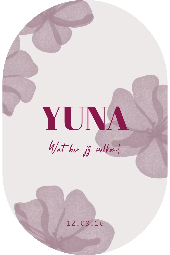 Een lief ovaal geboortekaartje voor jullie kindje. Het kaartje heeft een lichtroze achtergrond met paarse bloemen erop. Het design is helemaal naar smaak aan te passen in de online editor.