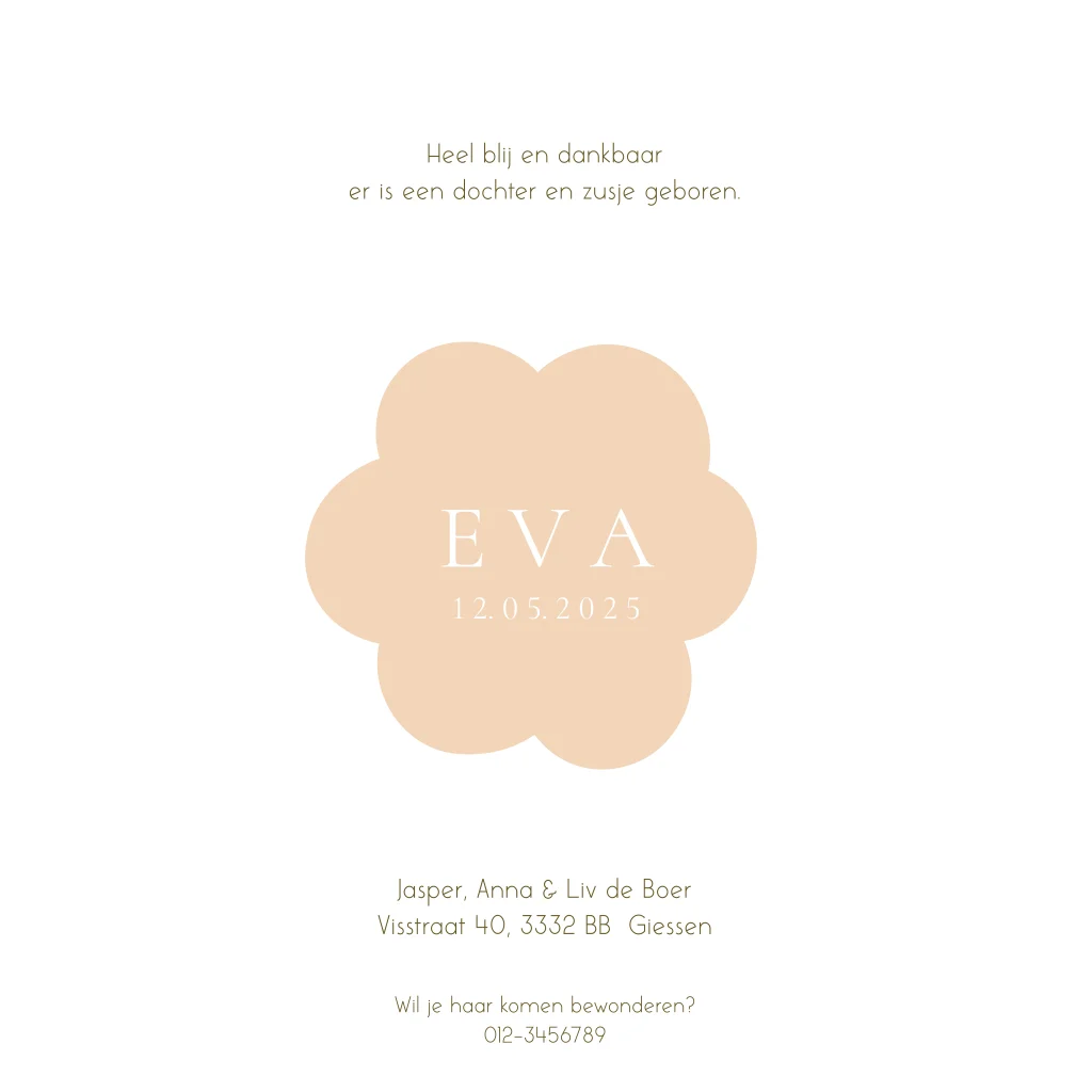 Een romantisch geboortekaartje voor de geboorte van jullie dochtertje. Het kaartje heeft mooie handgeschilderde takjes en een stans in de vorm van bloem. De stans vormt een doorkijkje naar de binnenkant van het kaartje. Aan de binnenkant staat de naam van jullie meisje in een zachtroze bloem geschreven.