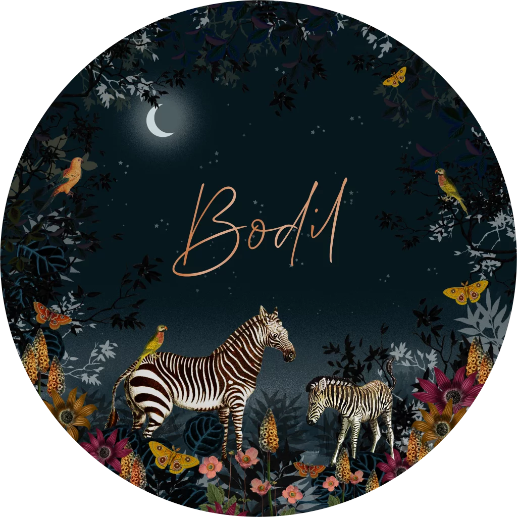 Een stijlvol geboortekaartje voor jouw dochter. Dit kaartje heeft een ronde vorm en prachtige illustraties van zebra's in het nachtlicht. Het kaartje heeft een warme dromerige uitstraling en prachtige illustraties van bloemen en takken.