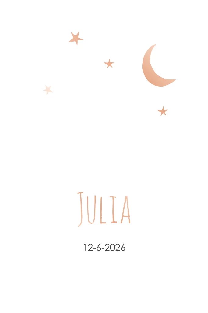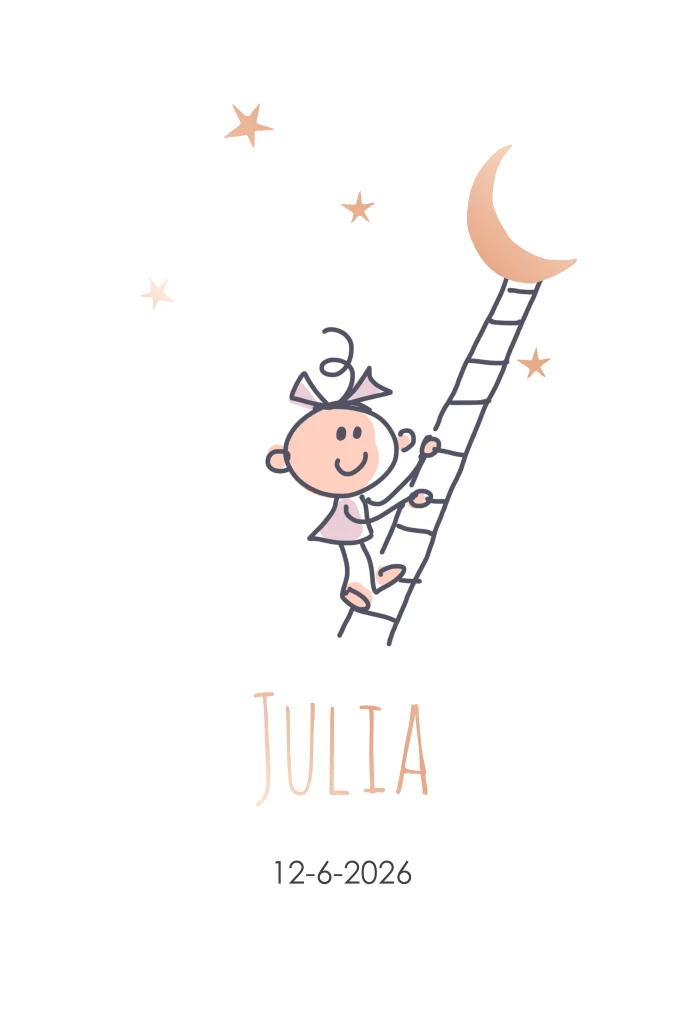 Kiekeboe! Achter het gaatje verschijnt een schattige illustratie van een meisje op een trap naar de maan. De maan, sterren en de naam worden gedrukt in rosègoudfolie. Om het kaartje nog een extra zachte uitstraling te geven heeft het kaartje ronde hoeken.