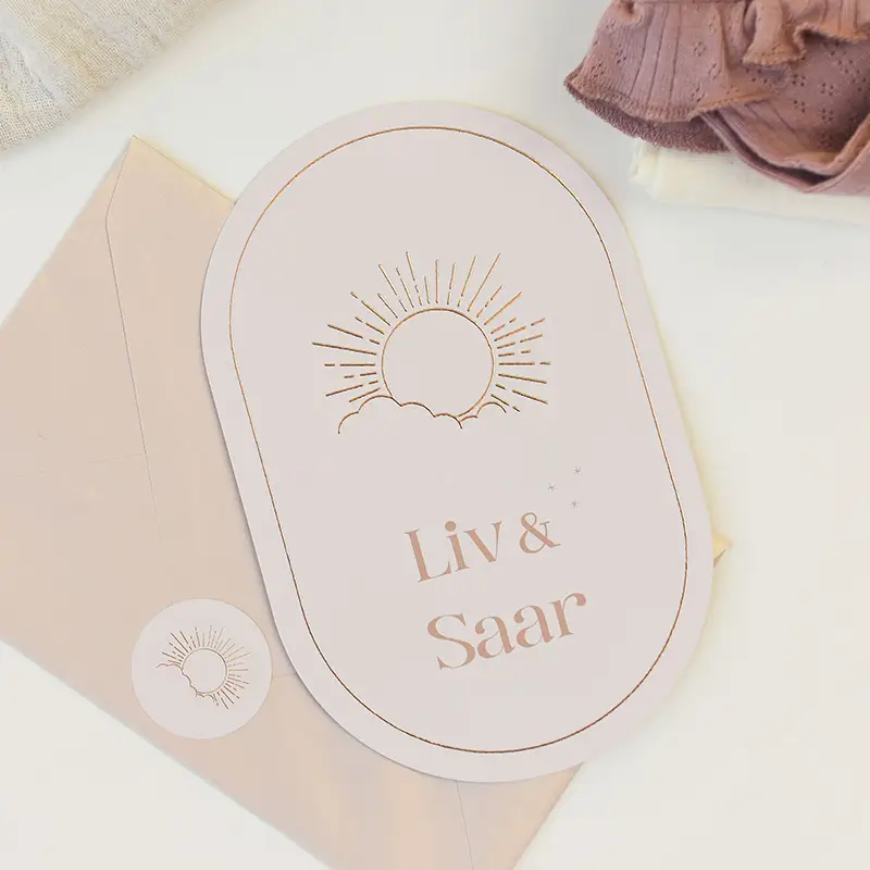 Kondig de geboorte van jullie kindje aan met dit originele stanskaartje. Op het kaartje staat een goudfolie lijntekening van een zon met daar onder een wolkje. De kaart heeft de vorm van een ovaal.