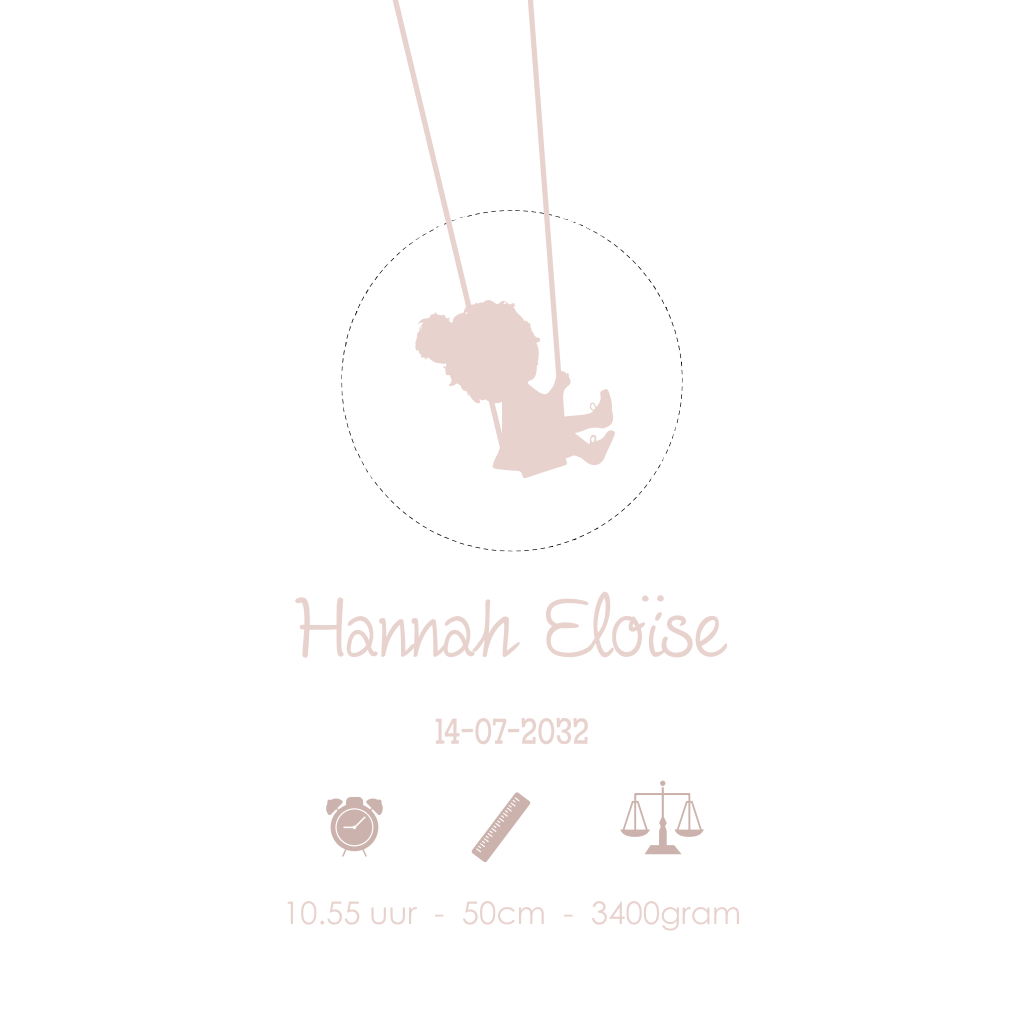 Kondig de geboorte van jullie dochter aan met dit lieve kaartje! Het kaartje heeft een lichtroze achtergrond en geeft een doorkijkje naar de binnenkant van de kaart. Hier is een silhouet van een meisje op een schommel te zien. Bestel snel een proefdruk om dit kaartje in het echt te zien!
