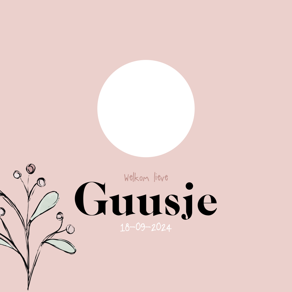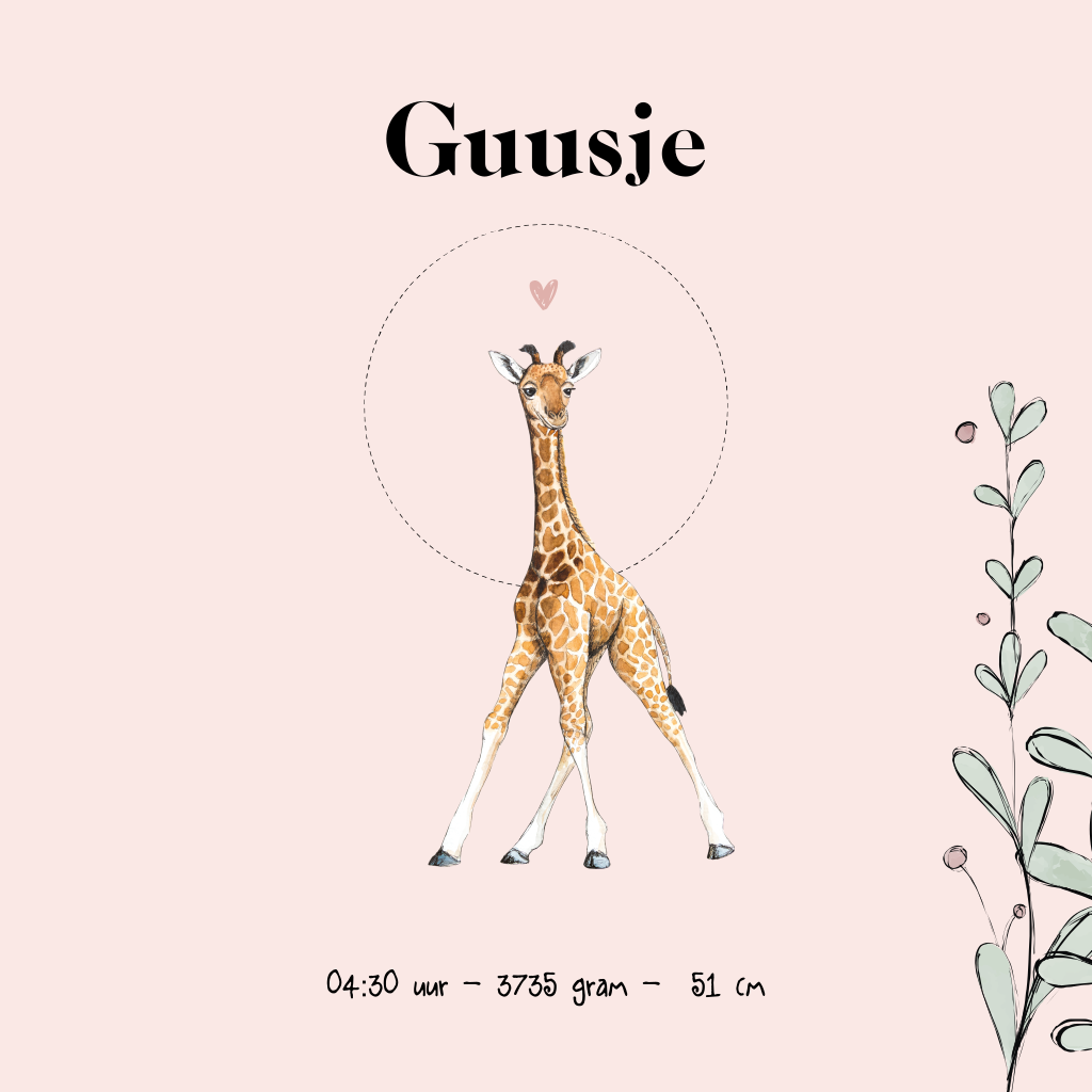 Dit is een stoer geboortekaartje voor jullie dochter. Op de roze voorkant staat de illustratie van een takje met bloemetjes. De uitsnede van een cirkel geeft een doorkijkje naar een giraffe aan de binnenkant van de kaart. Pas het kaartje naar wens aan in onze online editor en bestel snel een proefdruk om dit kaartje in het echt te zien!