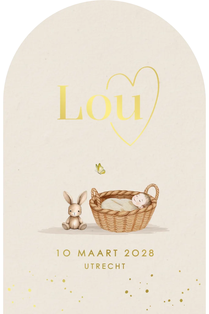 Wat een schattig geboortekaartje om de geboorte van jullie kindje aan te kondigen! Op de kaart staat een mooie illustratie van een baby in een mandje met een knuffelkonijn. De naam en het hartje worden in goudfolie gedrukt, wat de kaart een extra bijzondere uitstraling geeft.