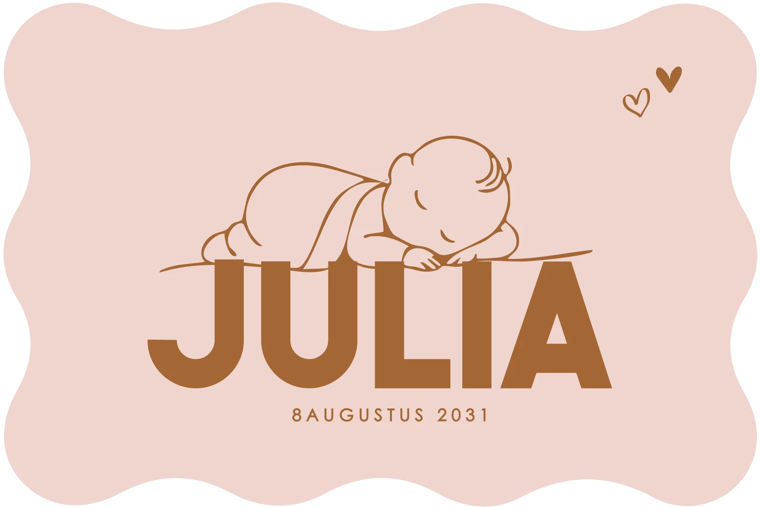 Dit lieve geboortekaartje heeft een zachte roze achtergrond, een golfrand en een serene lijntekening van een slapende baby. De naam van jullie kleintje staat mooi groot op de kaart, voor een persoonlijke touch. Pas het ontwerp naar wens aan in onze online editor.Plaats zelf de teksten en elementen eenvoudig op de juiste plek in onze opmaaktool. Heb je hier hulp bij nodig? Neem gerust even contact met ons op!