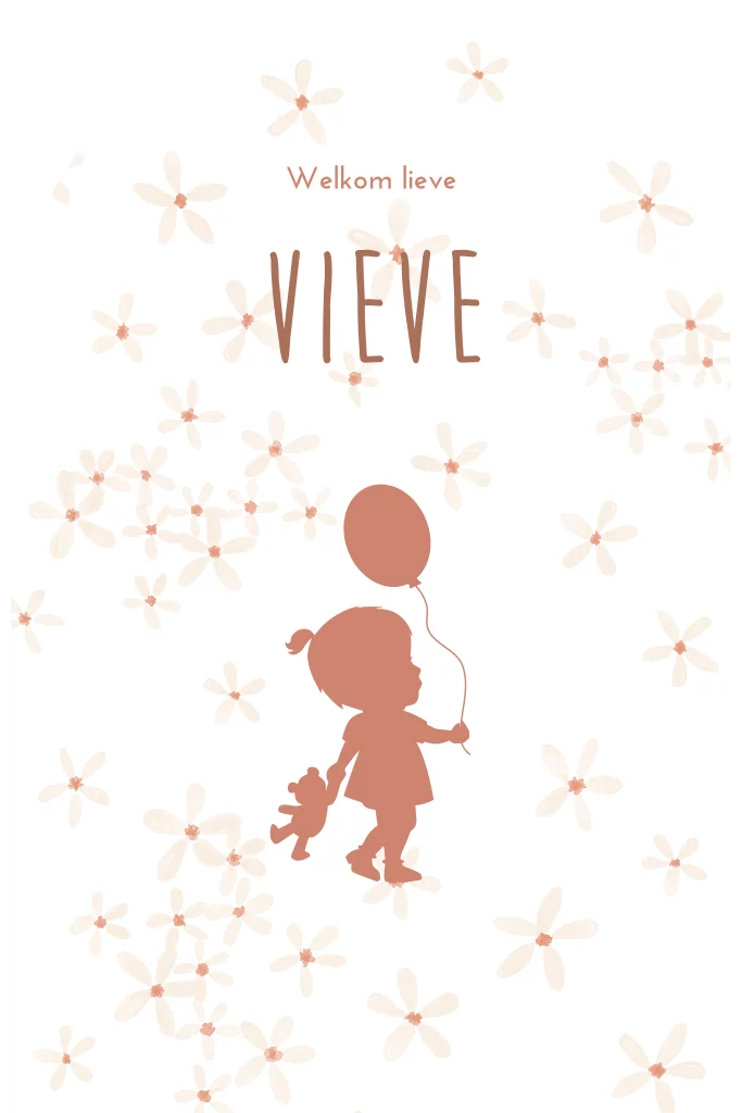 Een origineel geboortekaartje met de originele arch vorm. Op het geboortekaartje zie je een meisje staan met een ballon in haar hand en een knuffelbeer. Op de achtergrond zie je een zachte bloemenprint.