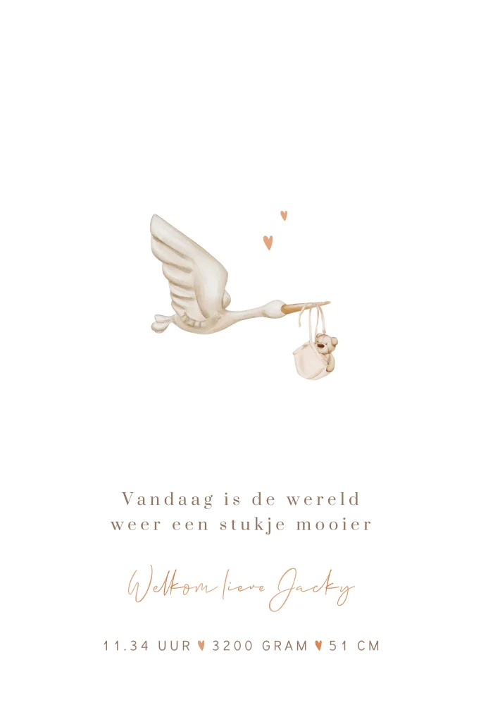 Een schattig geboortekaartje met ooievaar. Het staande kaartje heeft een leuk doorkijkje naar een leuke illustratie van een vliegende ooievaar met babytas. De naam is gedrukt in hoogglans en laat het kaartje echt schitteren.