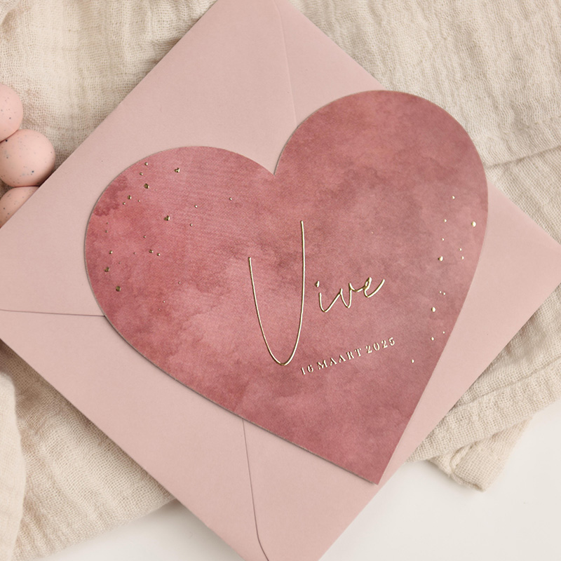Uniek hartvormig geboortekaartje met goudfolie en velvet-look